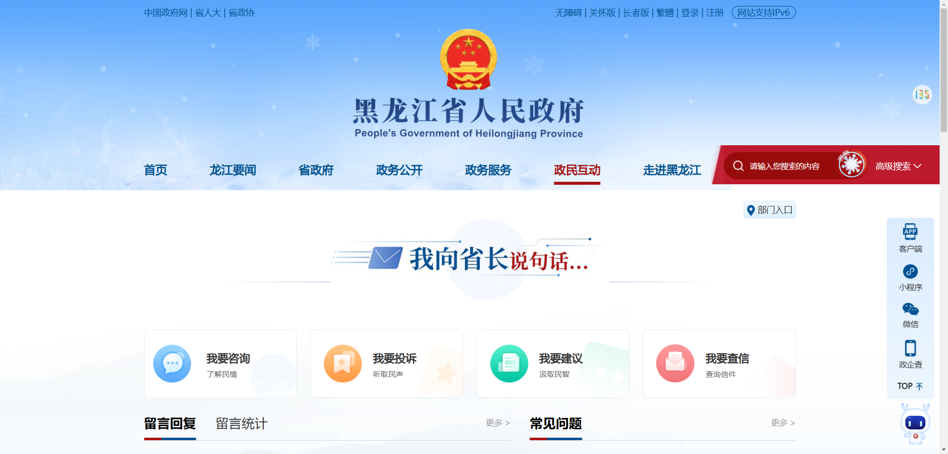 点击一级栏目“政民互动”,进入互动页面,可选择不同业务进行留言