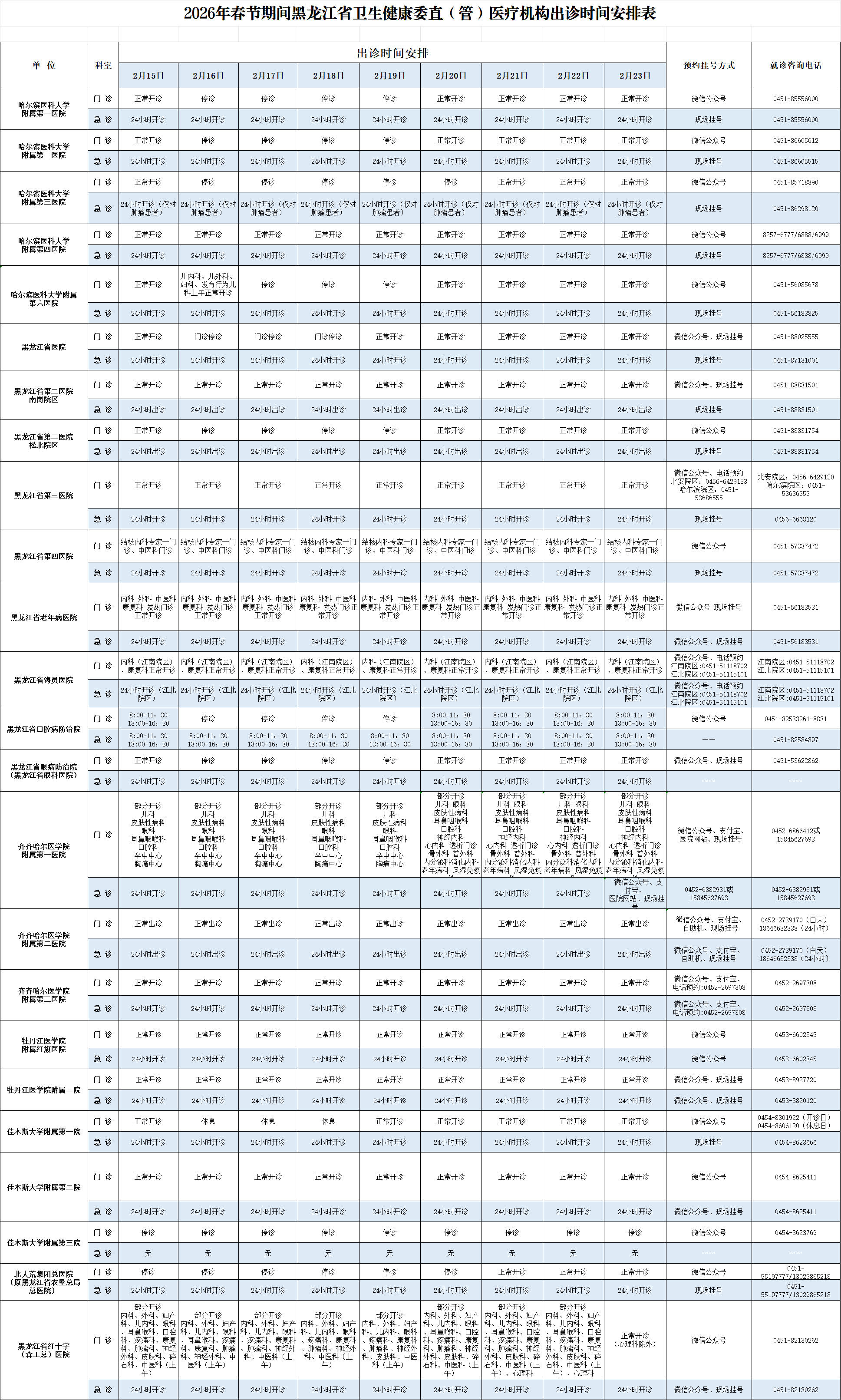 2026年春节期间黑龙江省卫生健康委直(管)医疗机构出诊时间安排表